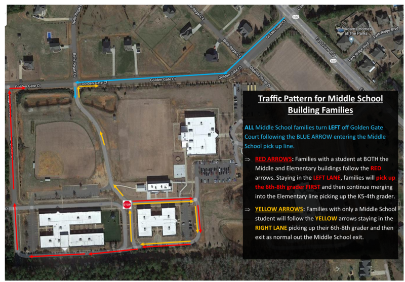 - 6th-8th grade families who DO NOT have a student at the Elementary building will stay in the RIGHT pickup lane of the Middle School and exit as normal out the Middle School building exit.